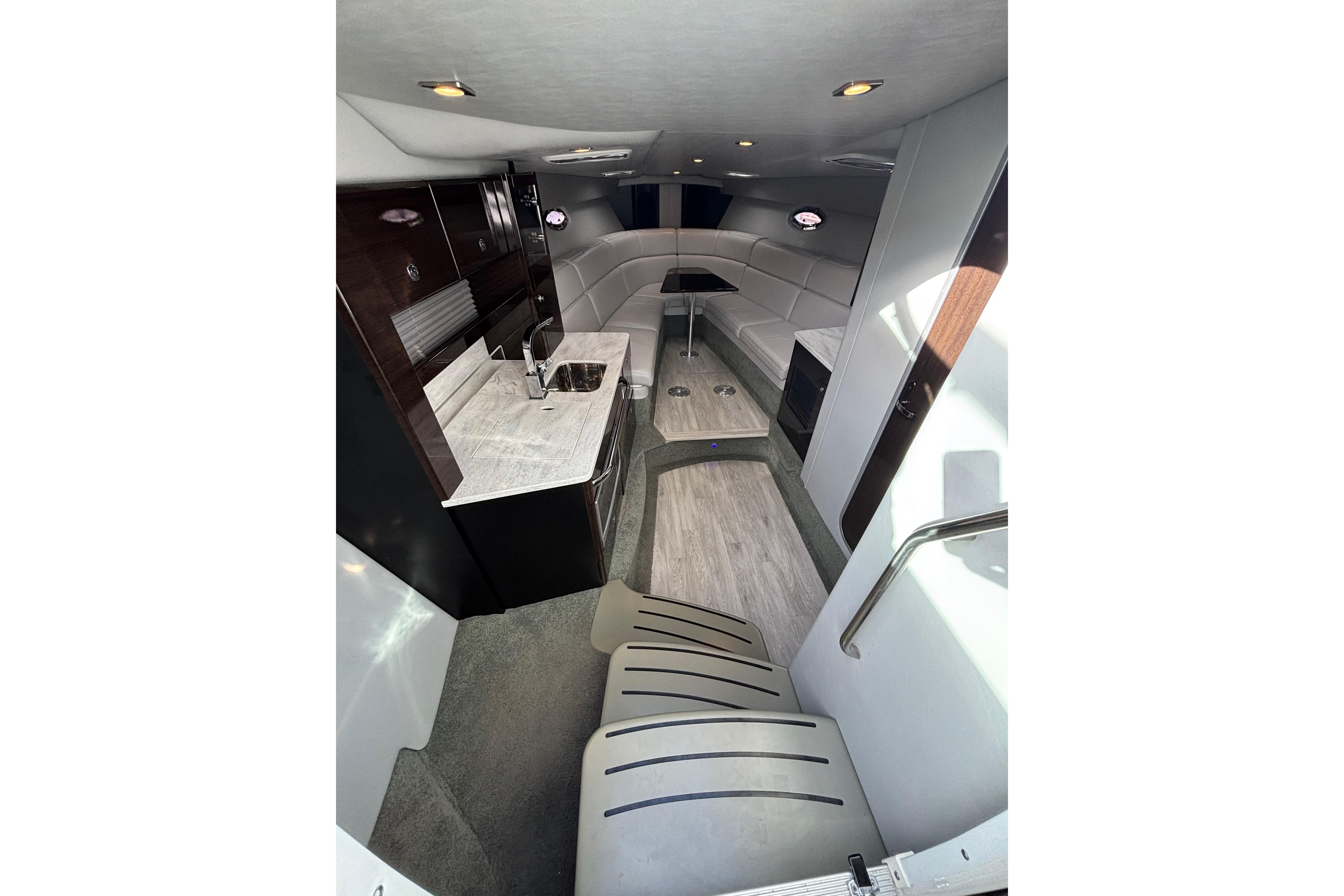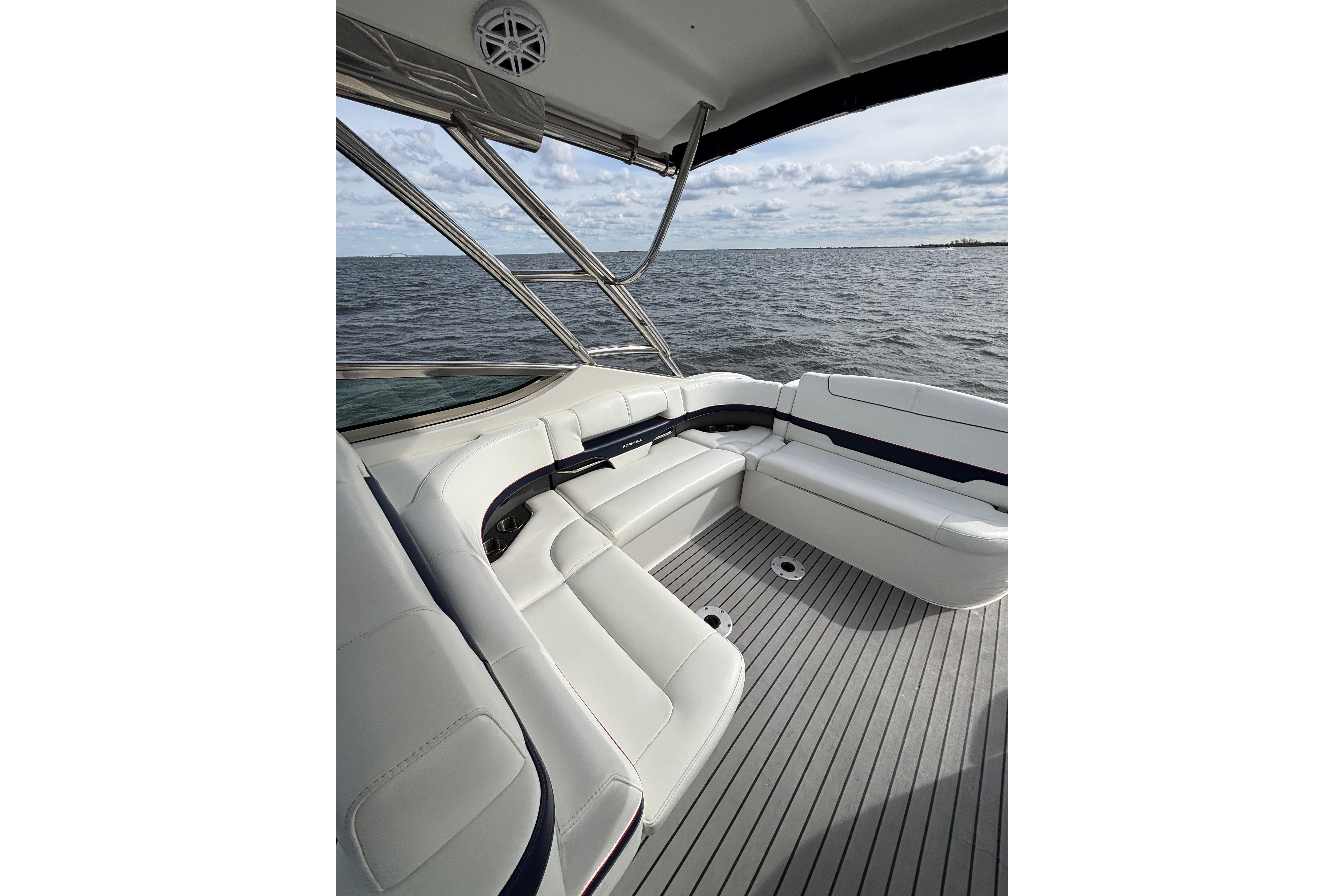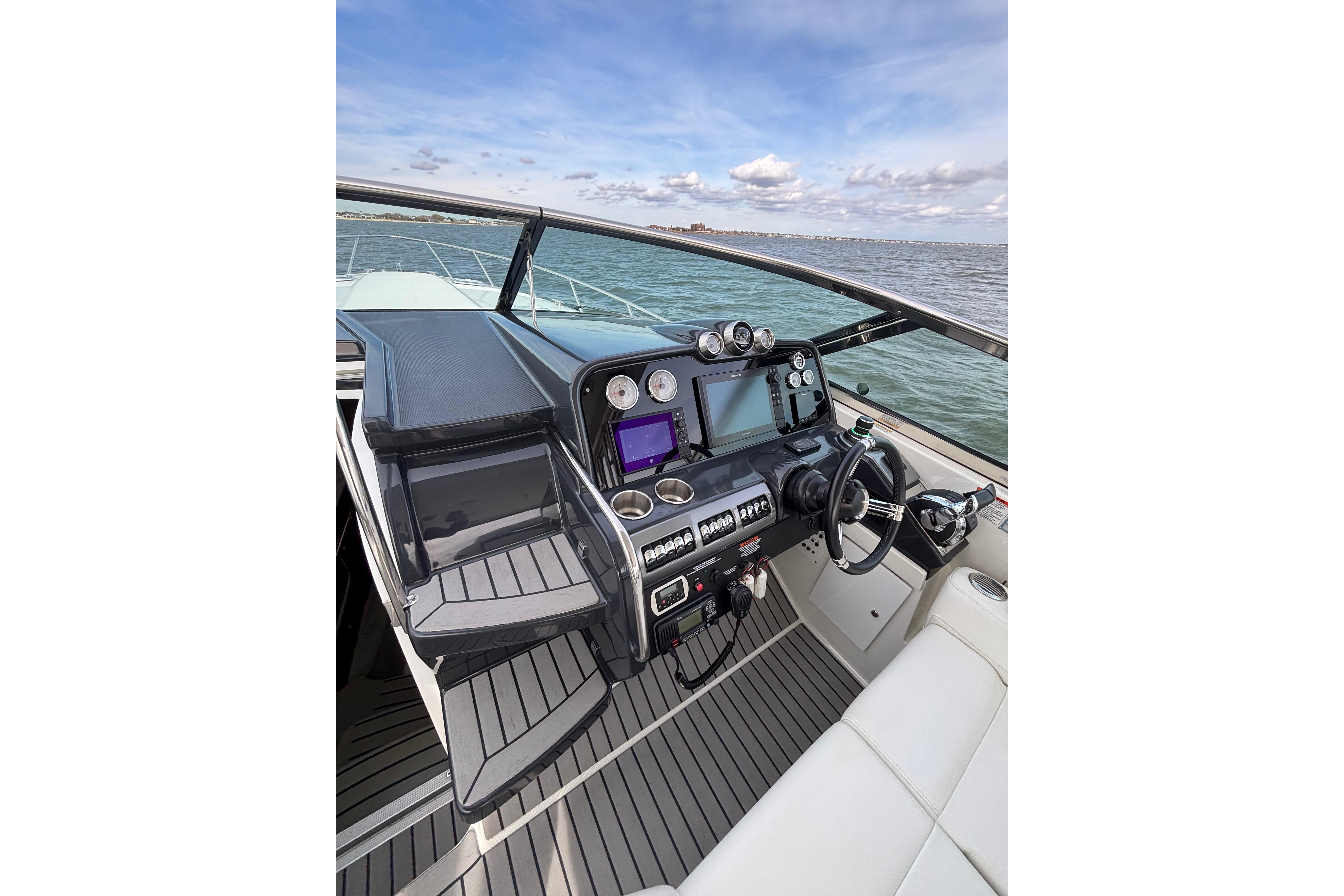 Powered by twin 8.2L MAG HO ECT 430 HP engines with SeaCore and Bravo III DTS, the boat delivers strong, confident performance with excellent handling. The helm is equipped with JPS VesselView with Active Trim, providing intuitive control and real-time system monitoring.