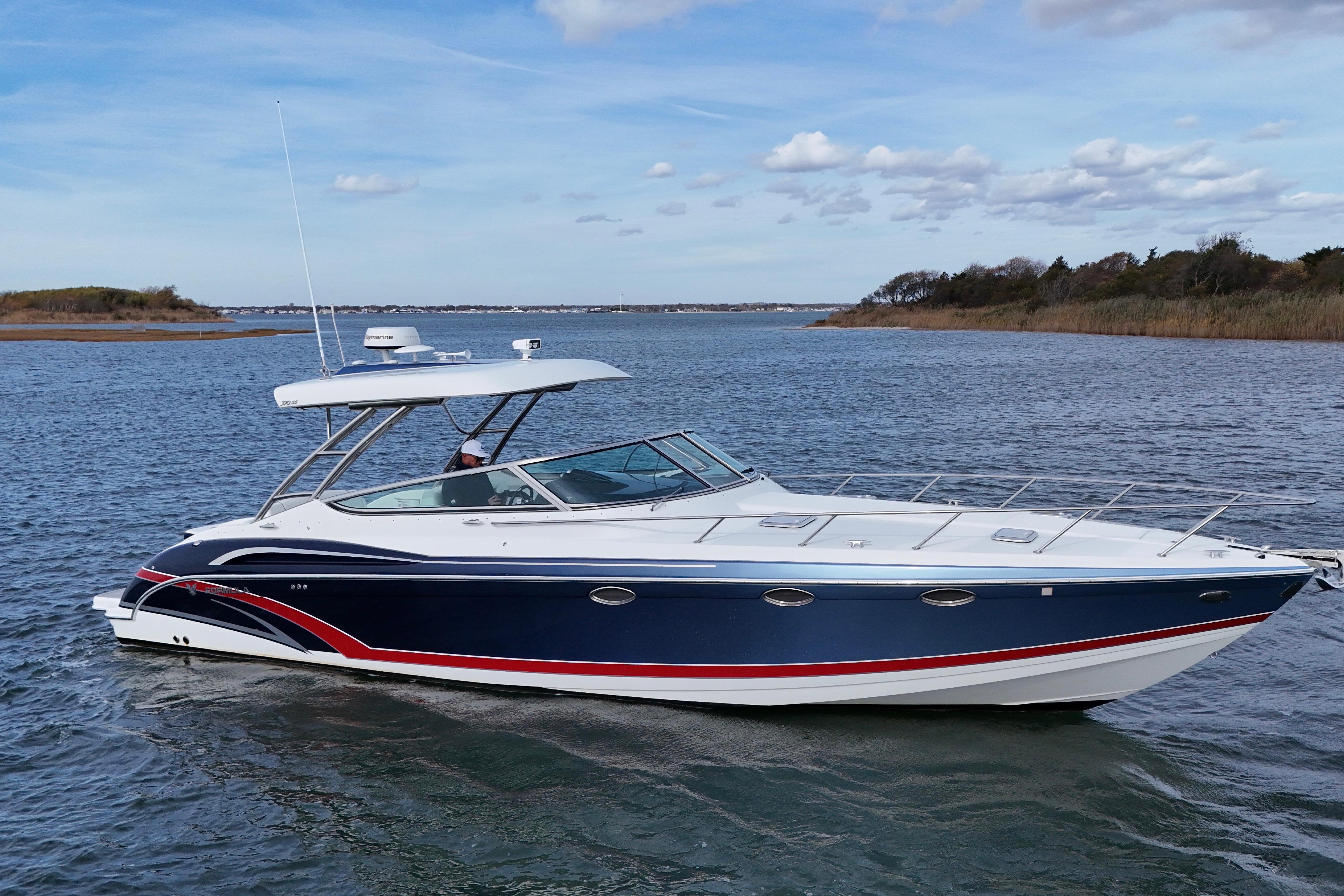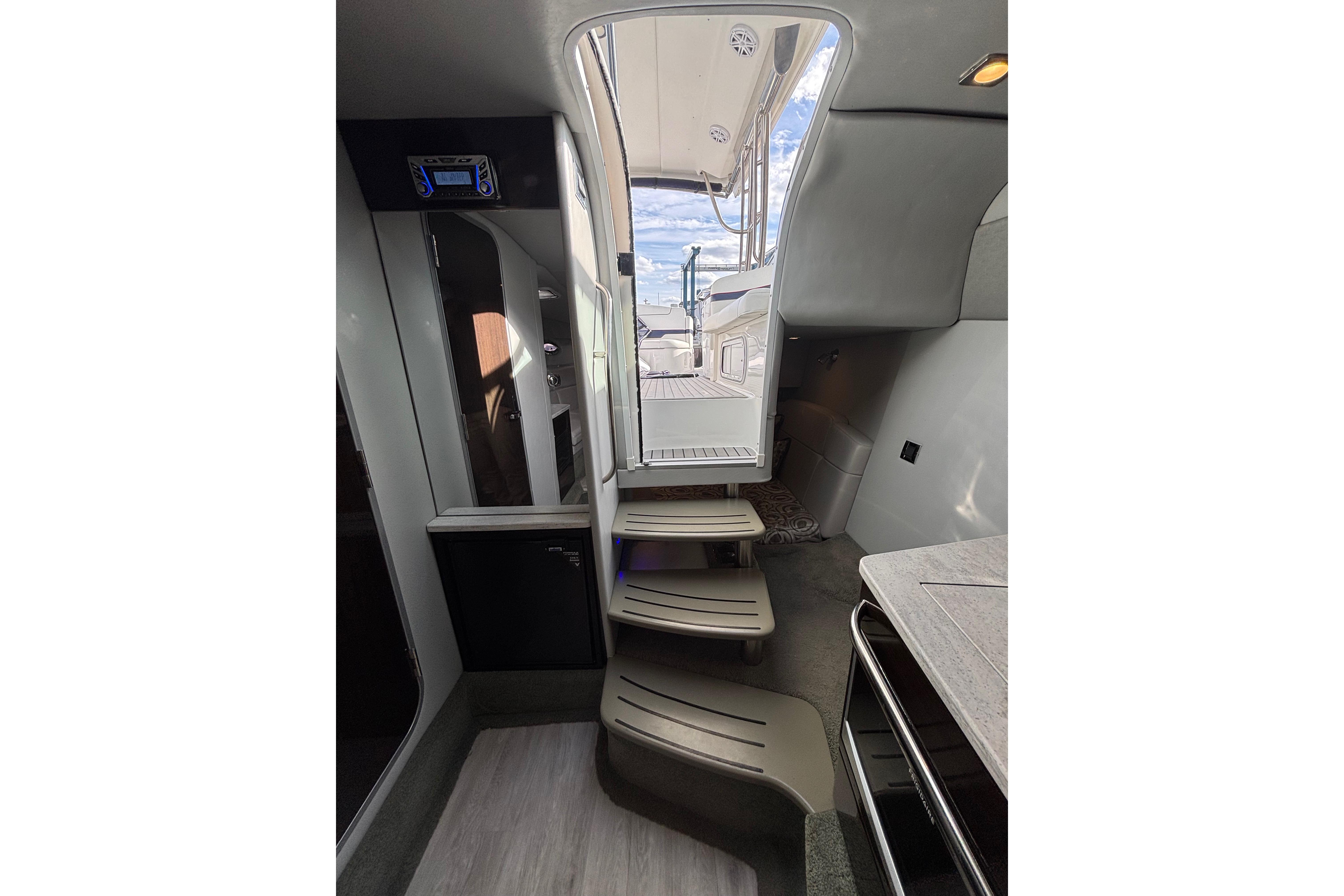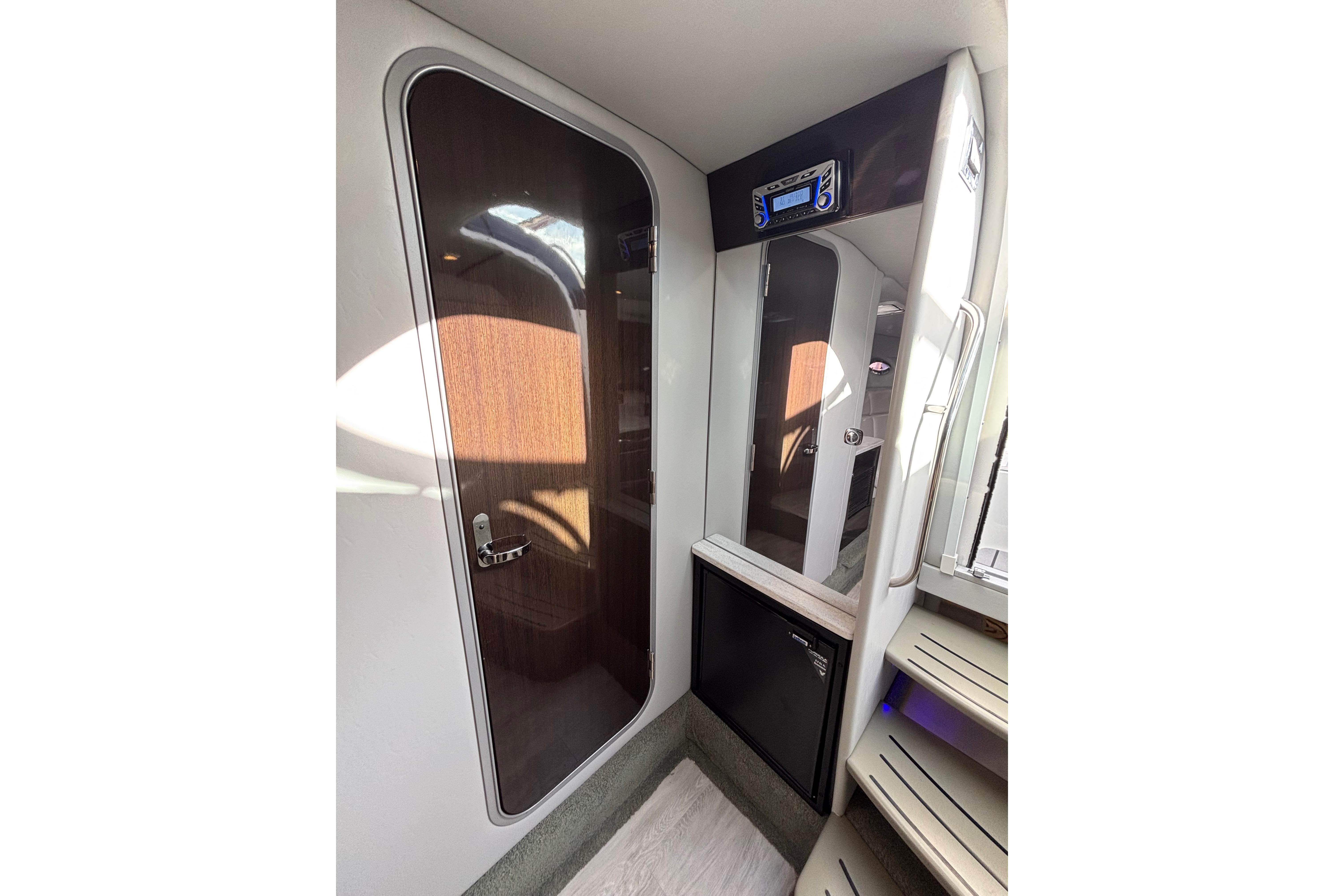 Powered by twin 8.2L MAG HO ECT 430 HP engines with SeaCore and Bravo III DTS, the boat delivers strong, confident performance with excellent handling. The helm is equipped with JPS VesselView with Active Trim, providing intuitive control and real-time system monitoring.