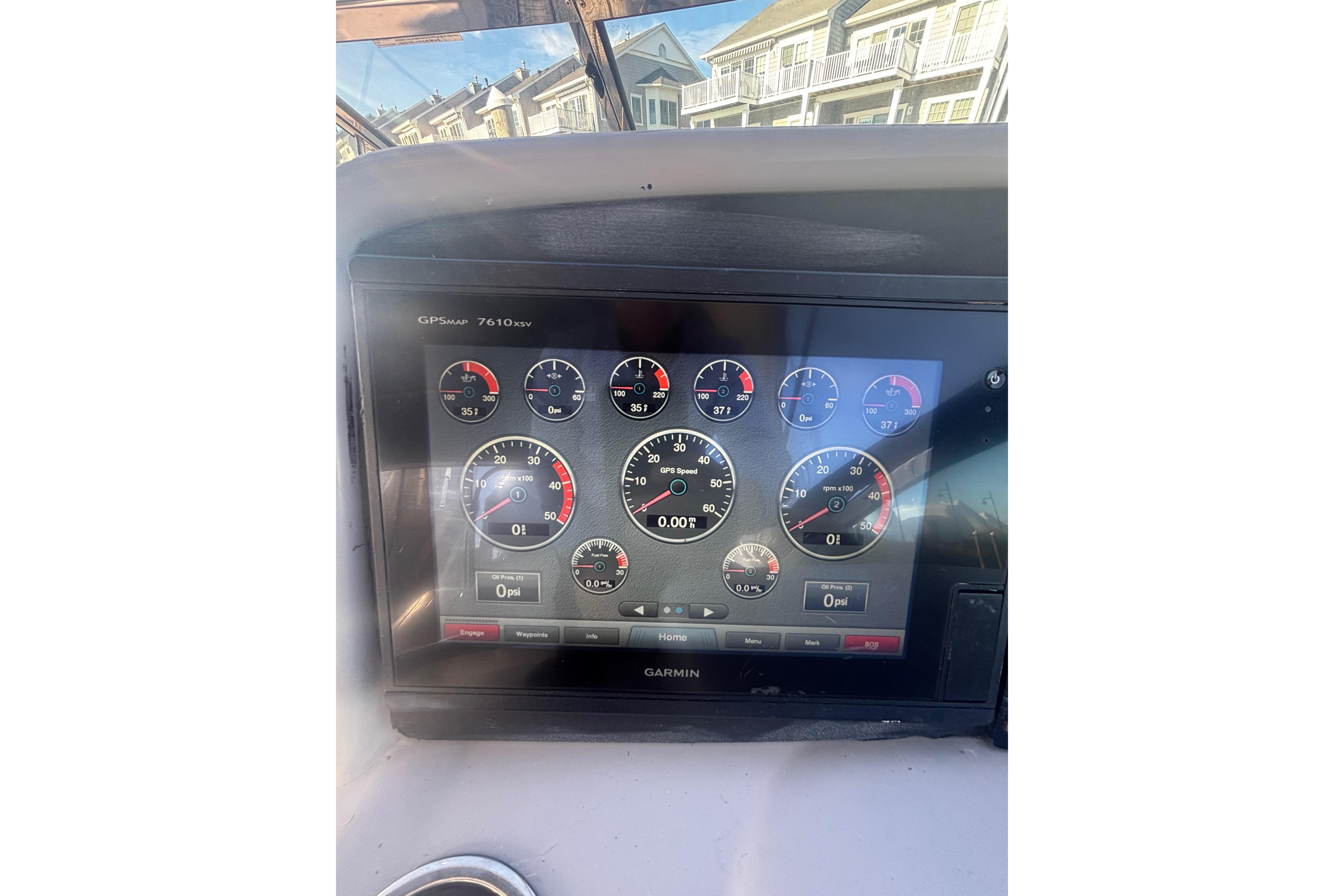 The helm is equipped with dual Garmin displays including a Garmin 7610 XSV and Garmin 7612 12-inch, with full engine data integration, Garmin radar, VHF radio, and an upgraded stereo system. Deck equipment includes a bow thruster, anchor windlass, anchor washdown, and a Westerbeke 7.6 kW diesel generator.