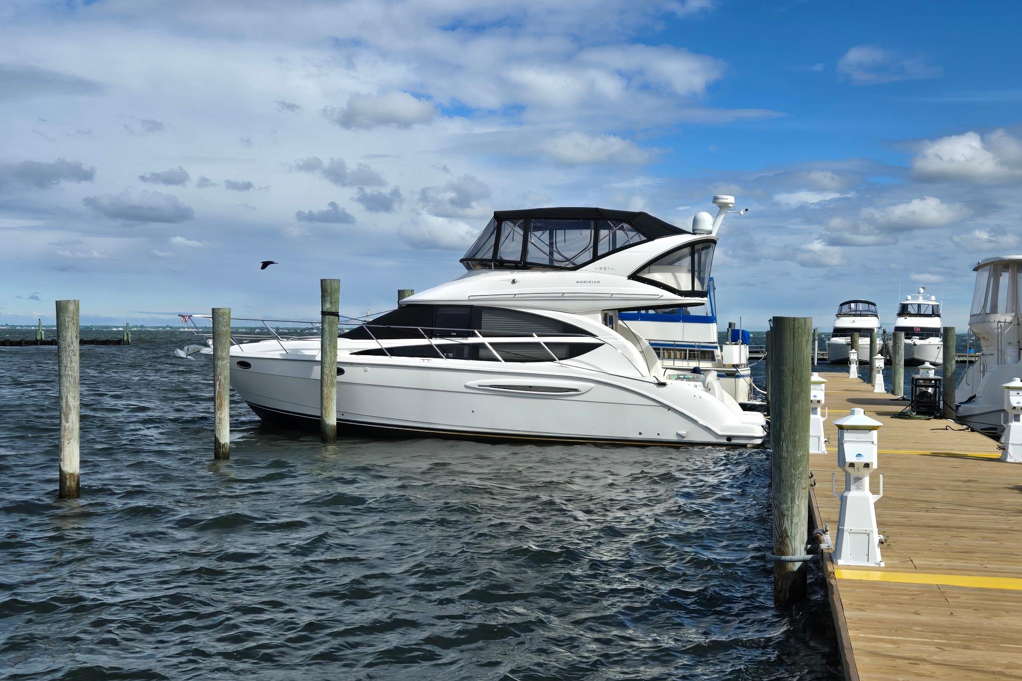 Meridian designed its 391 Sedan to bring the styling and performance of a sportscar to the class without losing any practical features. This attractive yacht's sleek profile conceals a wide-open salon with warm cherry-wood interior, premium-gloss finish, homelike seating arrangements and 360-degree views of the horizon. She also features a dedicated dinette and fully-equipped galley that are seamlessly integrated into the main living space, two large staterooms and separate shower and head compartments, each with its own vanity and sink. The flybridge's distinctive overhang offers more space topside as well as cockpit weather protection, and its molded-in steps are hinged to provide direct engine-room access.