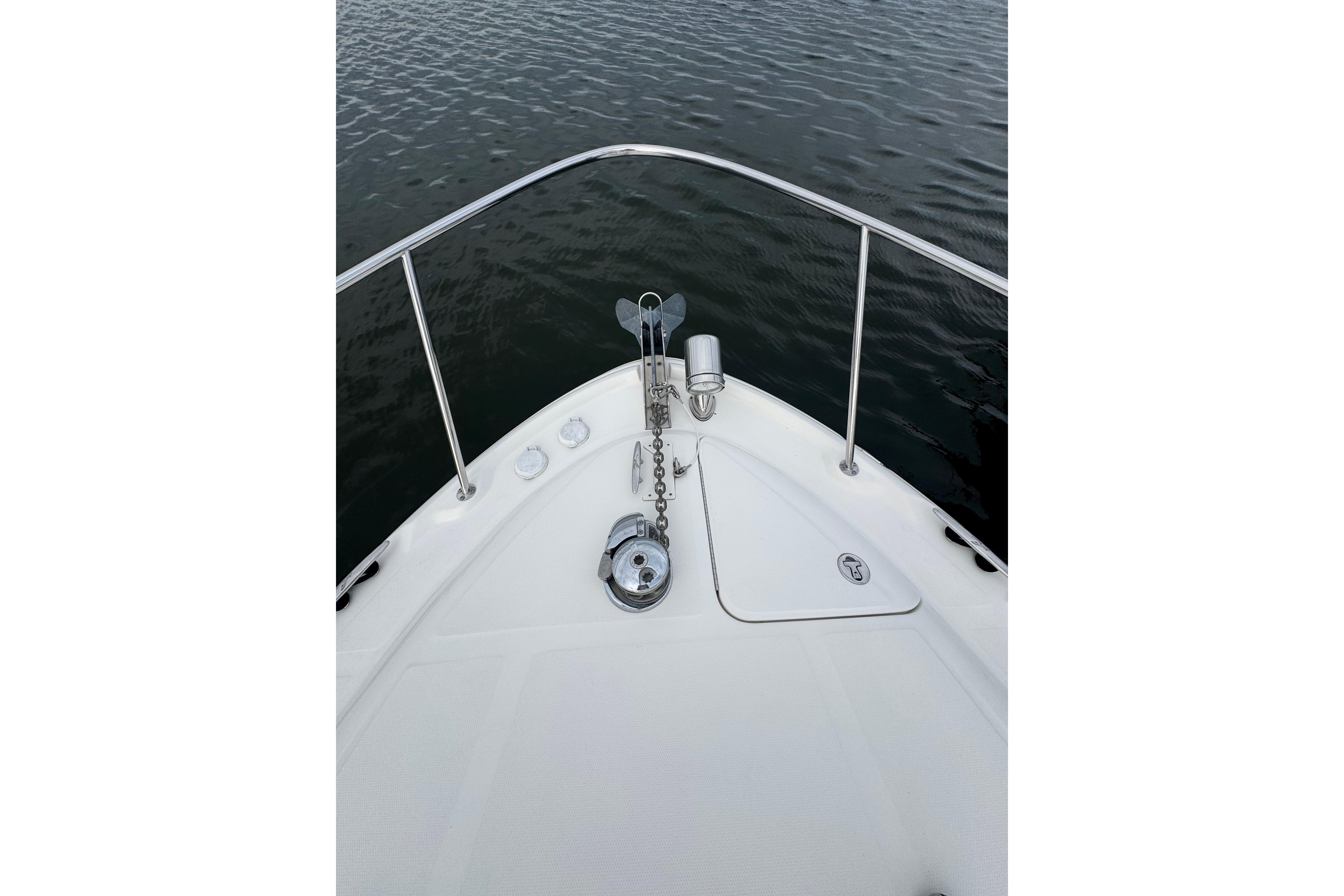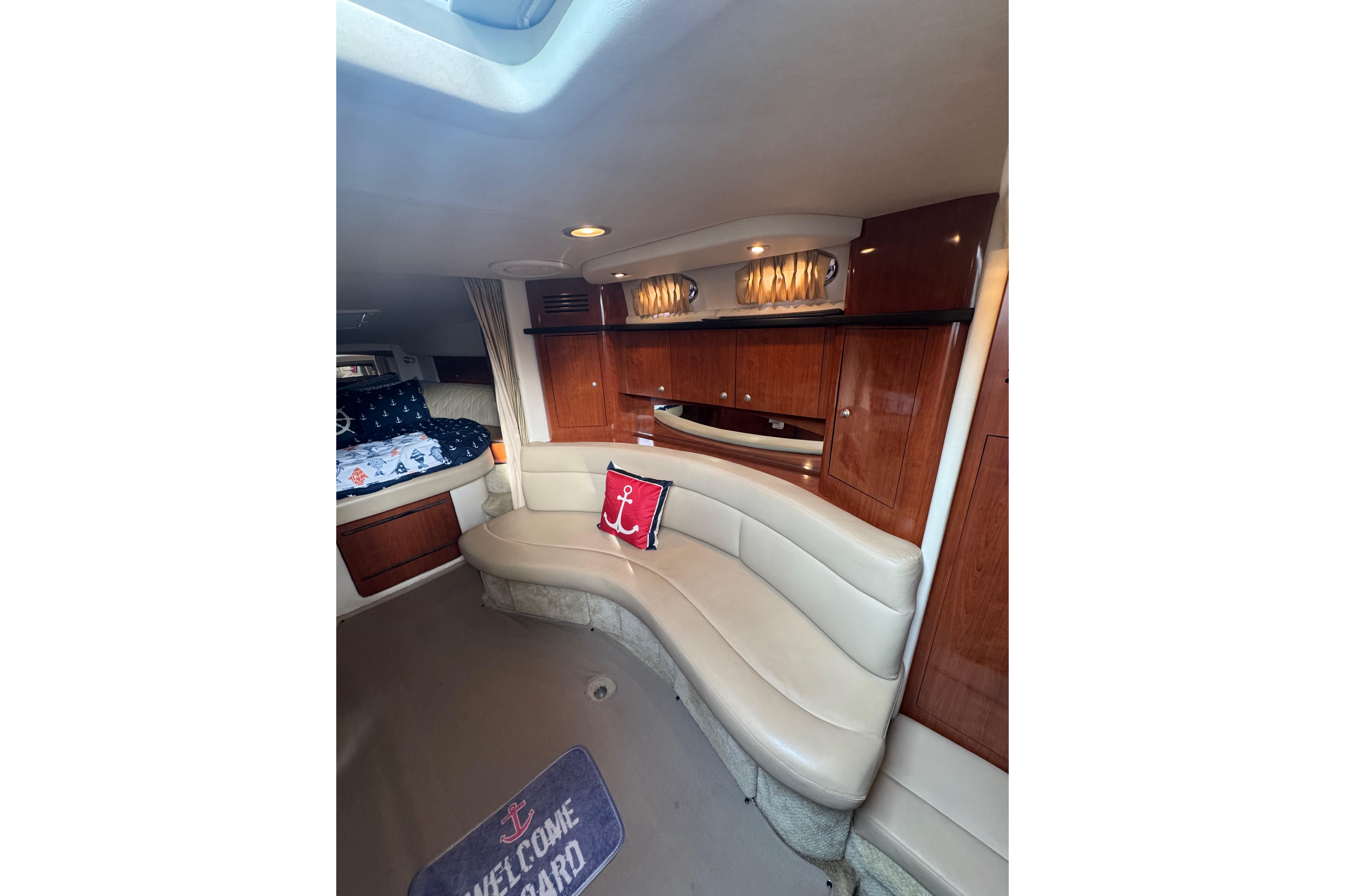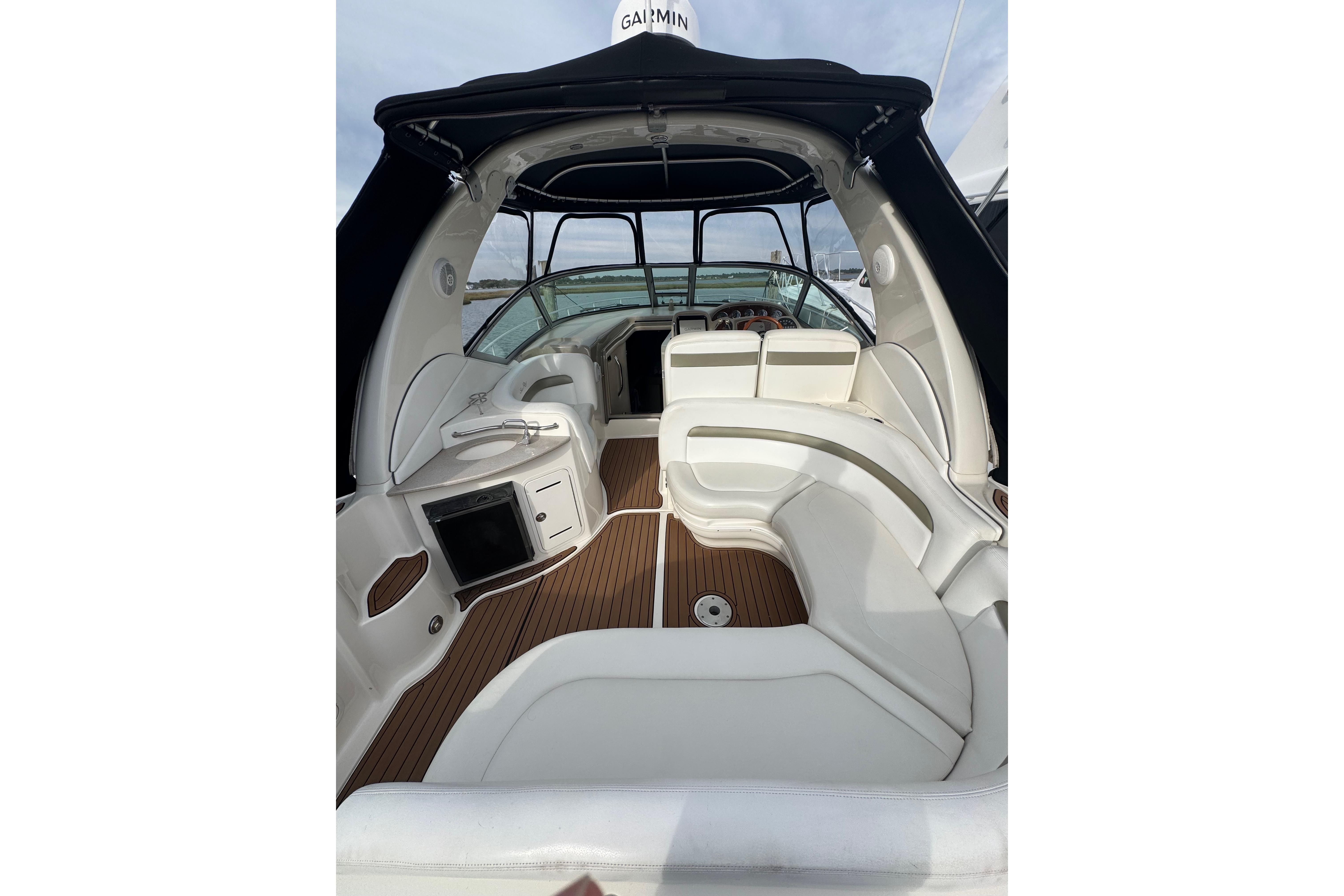 Enjoy a roomy wraparound seating area with a cockpit wet bar, sink, and refrigerator. The helm is well laid out with a double-wide captain’s seat and excellent visibility.