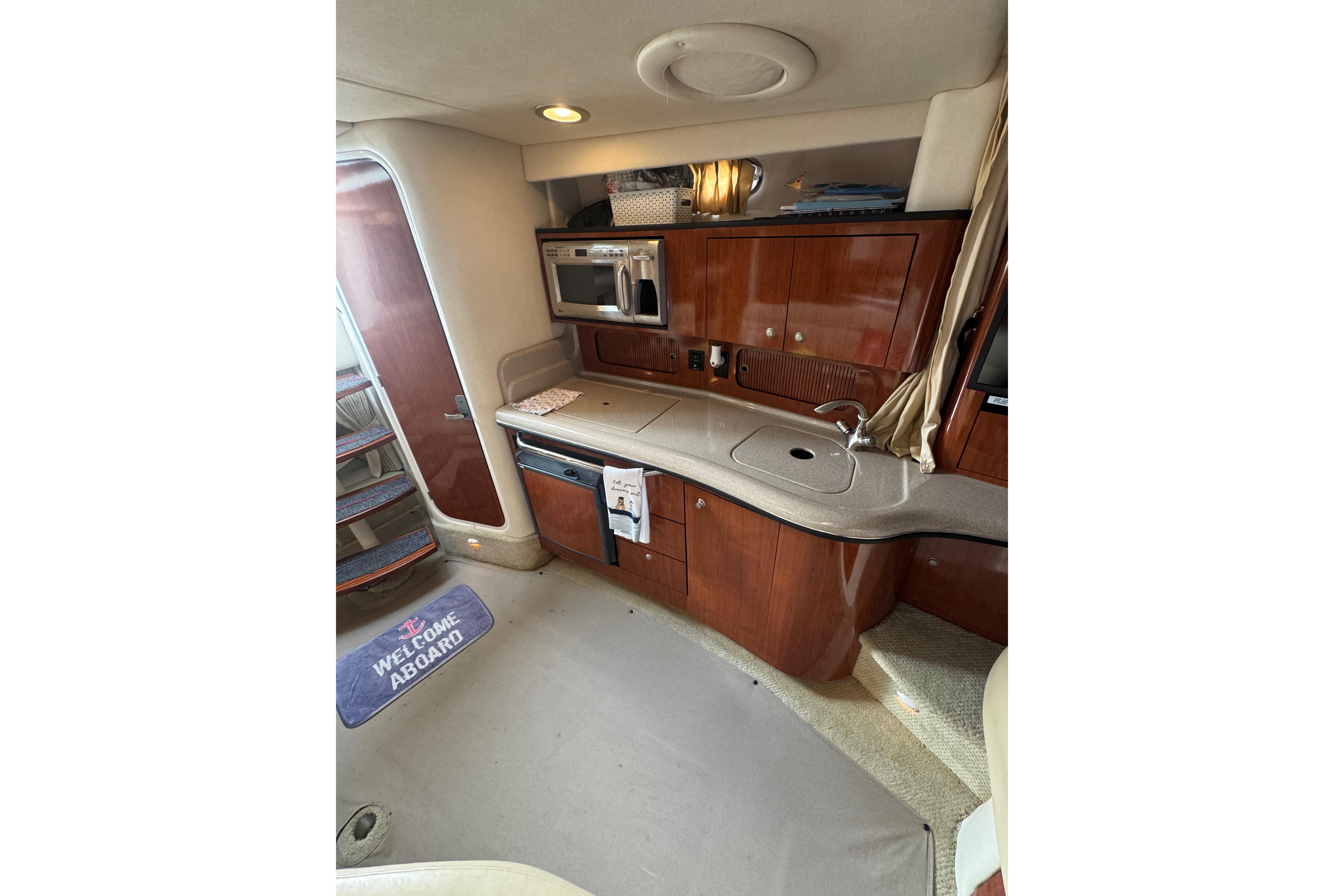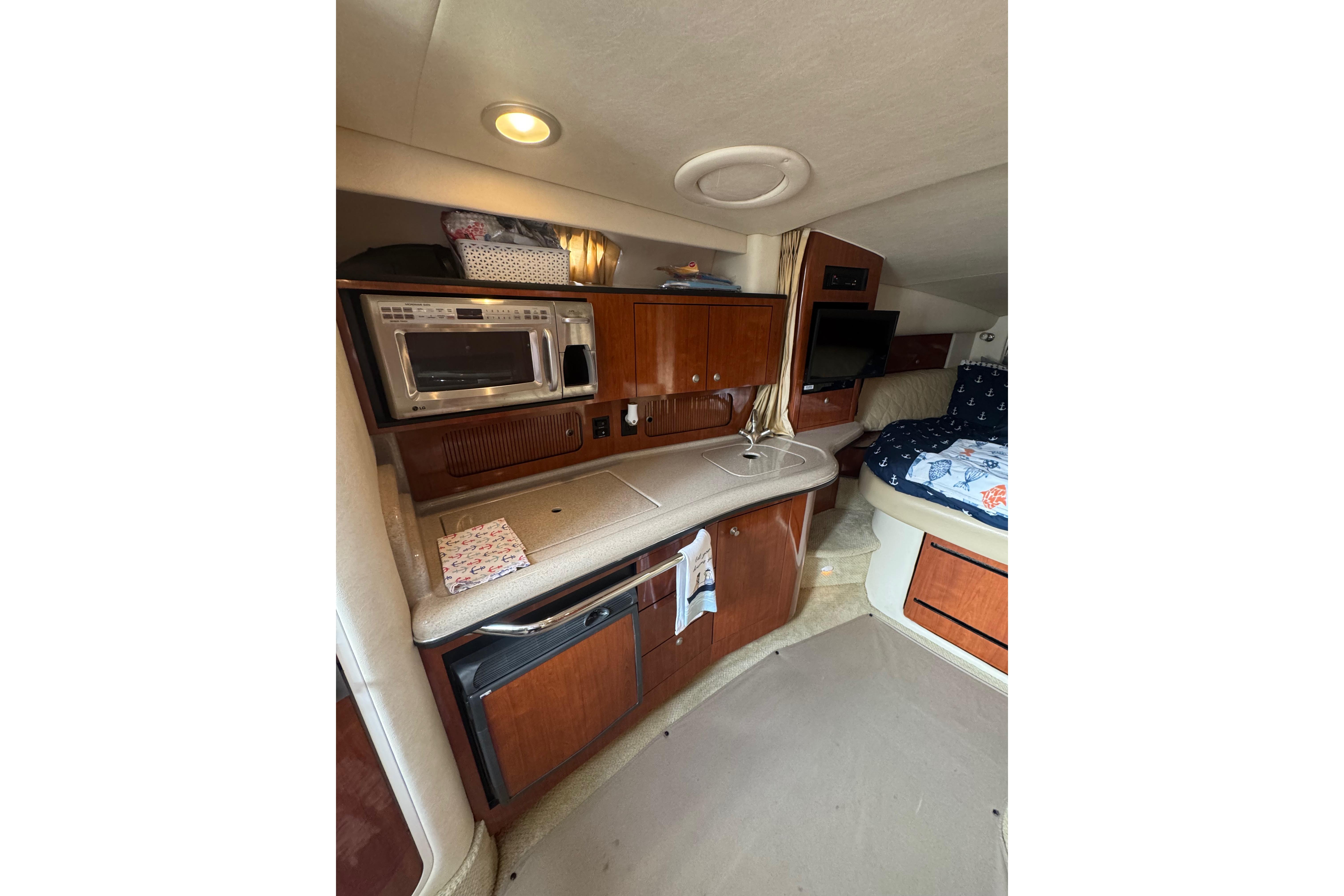 Features a refrigerator, microwave, dual-burner stove, and sink — everything you need for extended cruising.