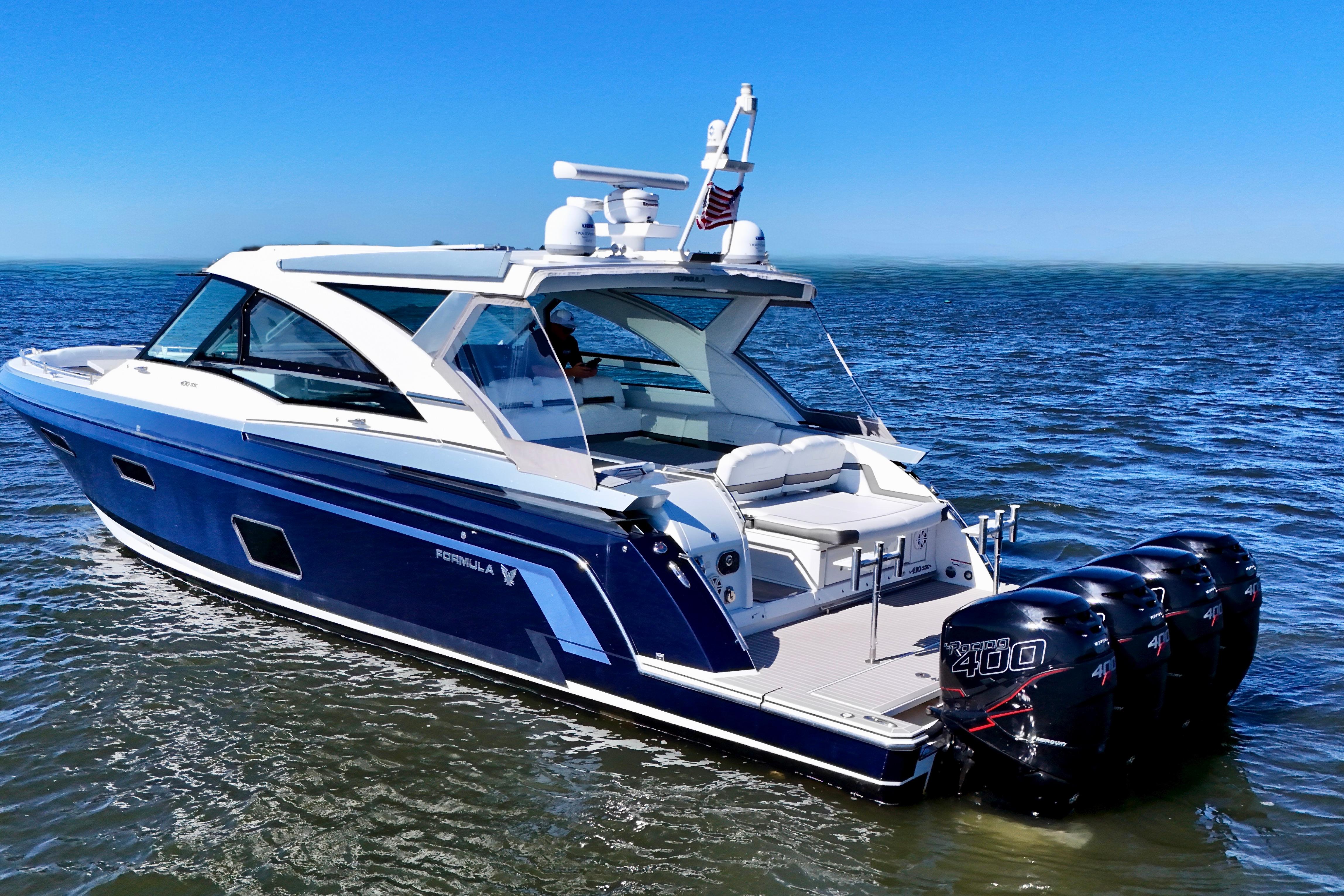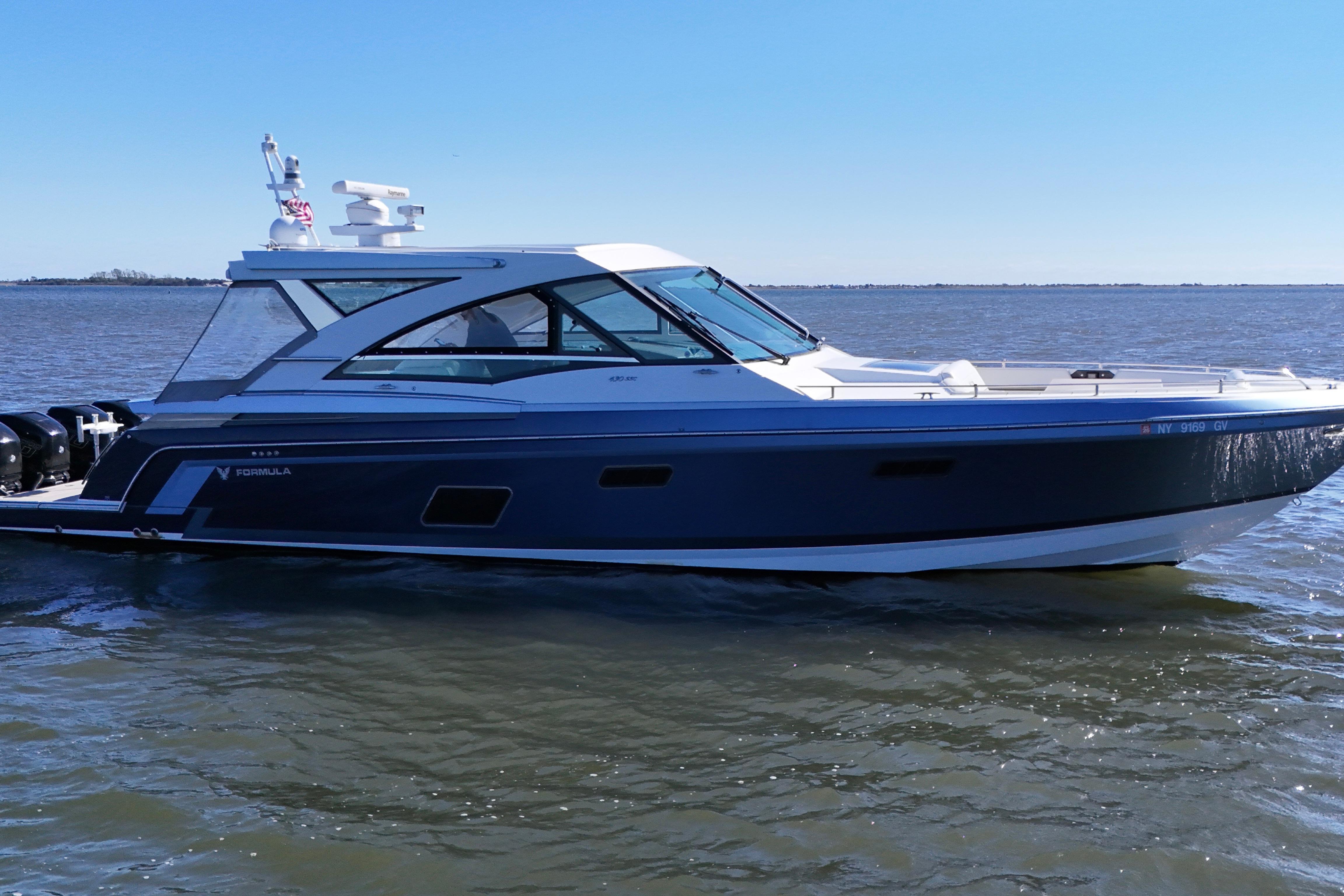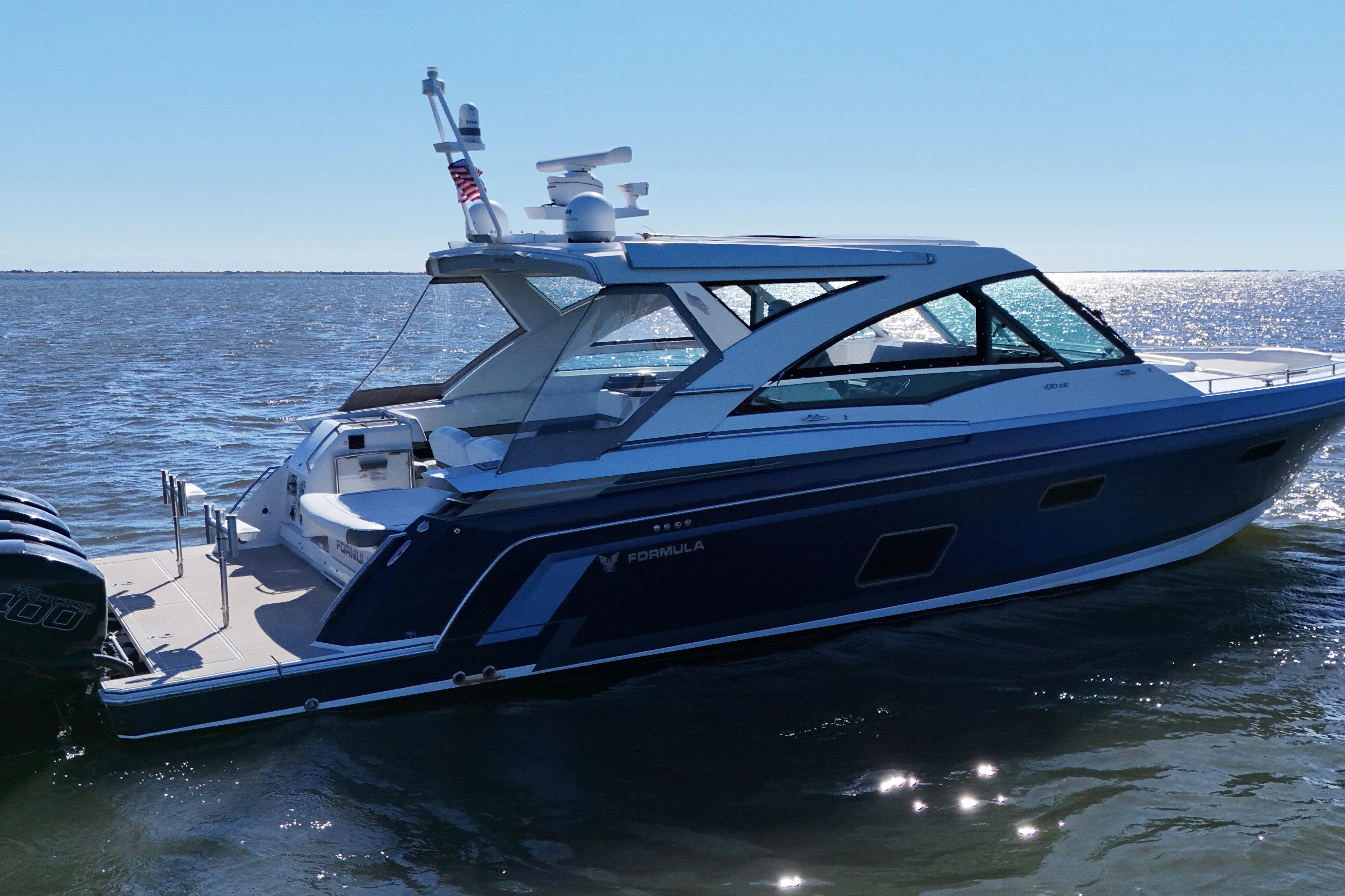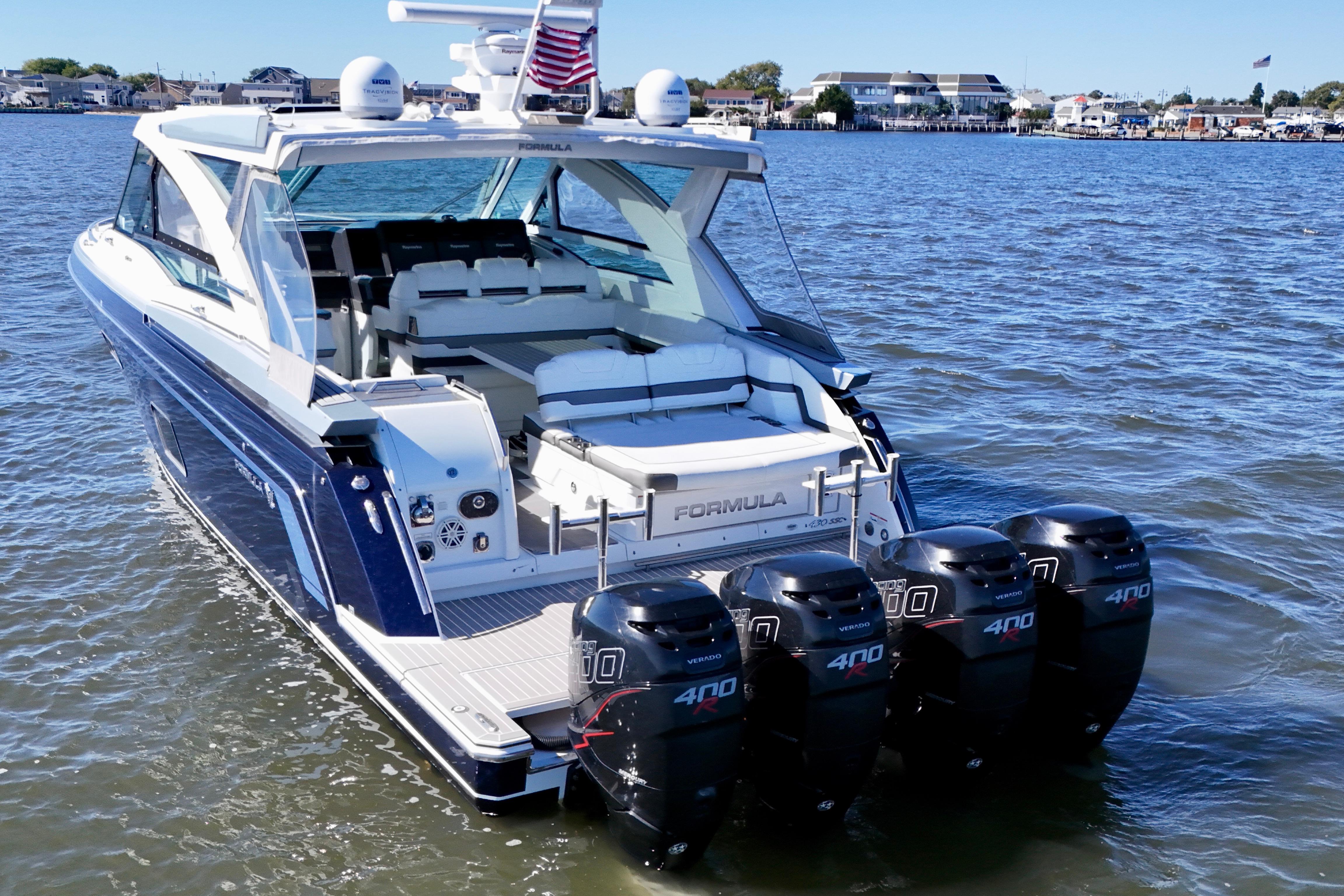 Introducing the 2017 Formula 430 Super Sport Crossover, a stunning cruiser that combines elegance with high performance. With an overall length of 43 feet, this vessel boasts a sleek fiberglass hull designed in a Deep Vee shape, ensuring a smooth ride even in choppy waters. Powered by four Mercury Verado 400R outboard engines, each delivering 400 horsepower, it reaches cruising speeds of 40 mph and a maximum hull speed of 65 mph, making it perfect for thrilling adventures on the water. Accommodating up to 12 guests, this boat features two cabins and one head, providing comfort for extended outings. An electric windlass enhances convenience, while the joystick control adds to the ease of maneuverability. With only 300 hours of use, this used cruiser is ready for new adventures, offering a perfect blend of luxury and performance for discerning boaters. Experience the joy of cruising with the Formula 430 Super Sport Crossover!