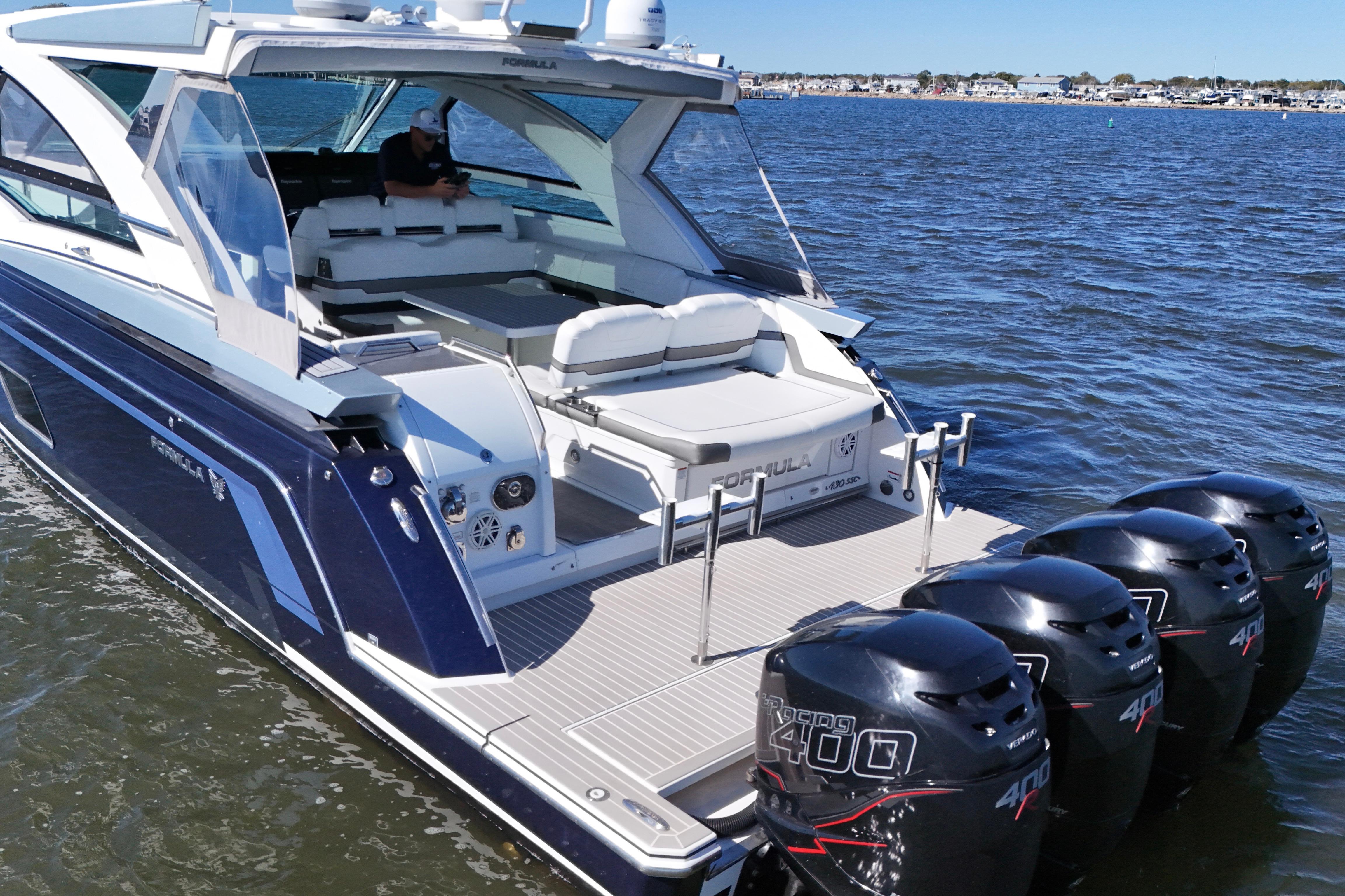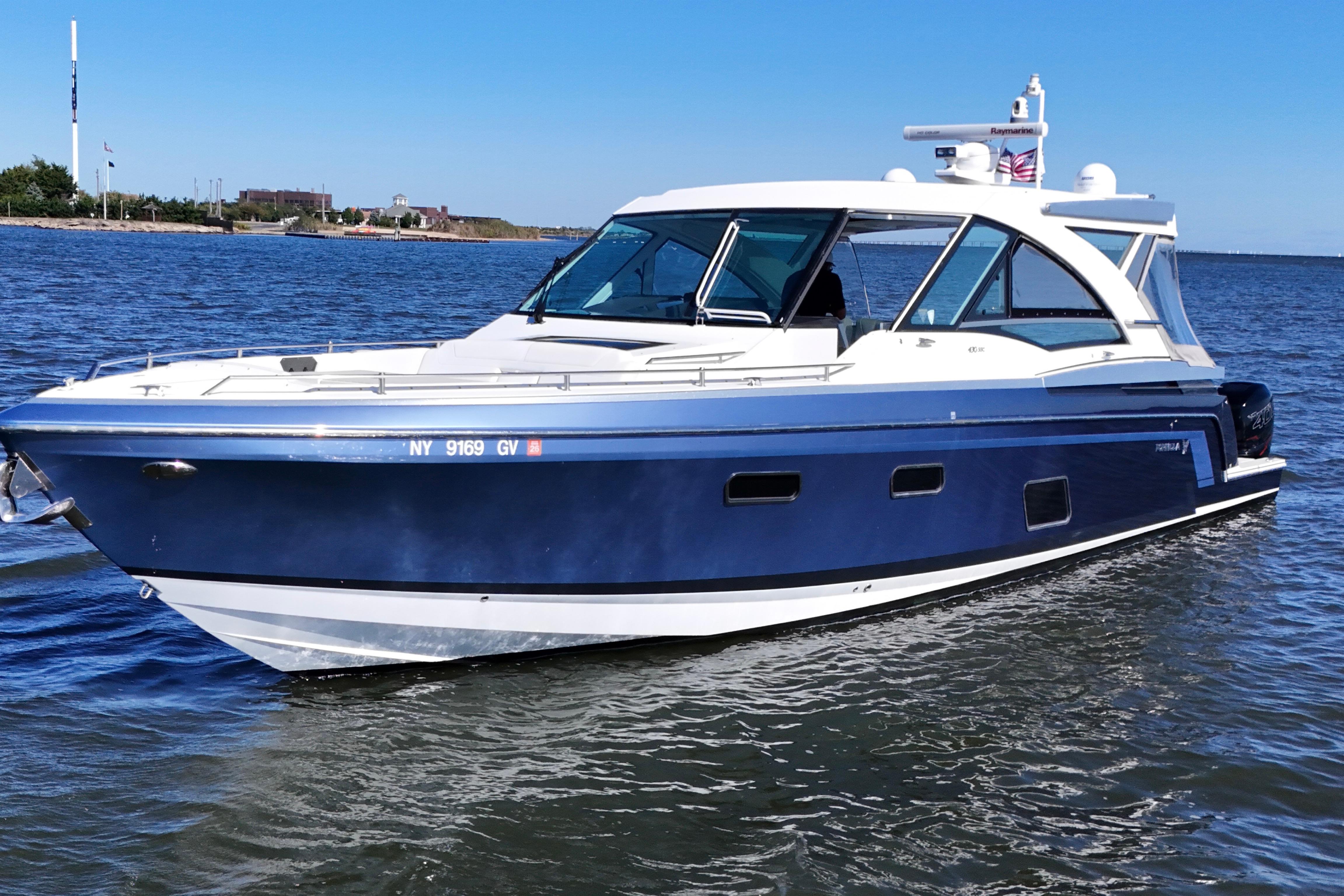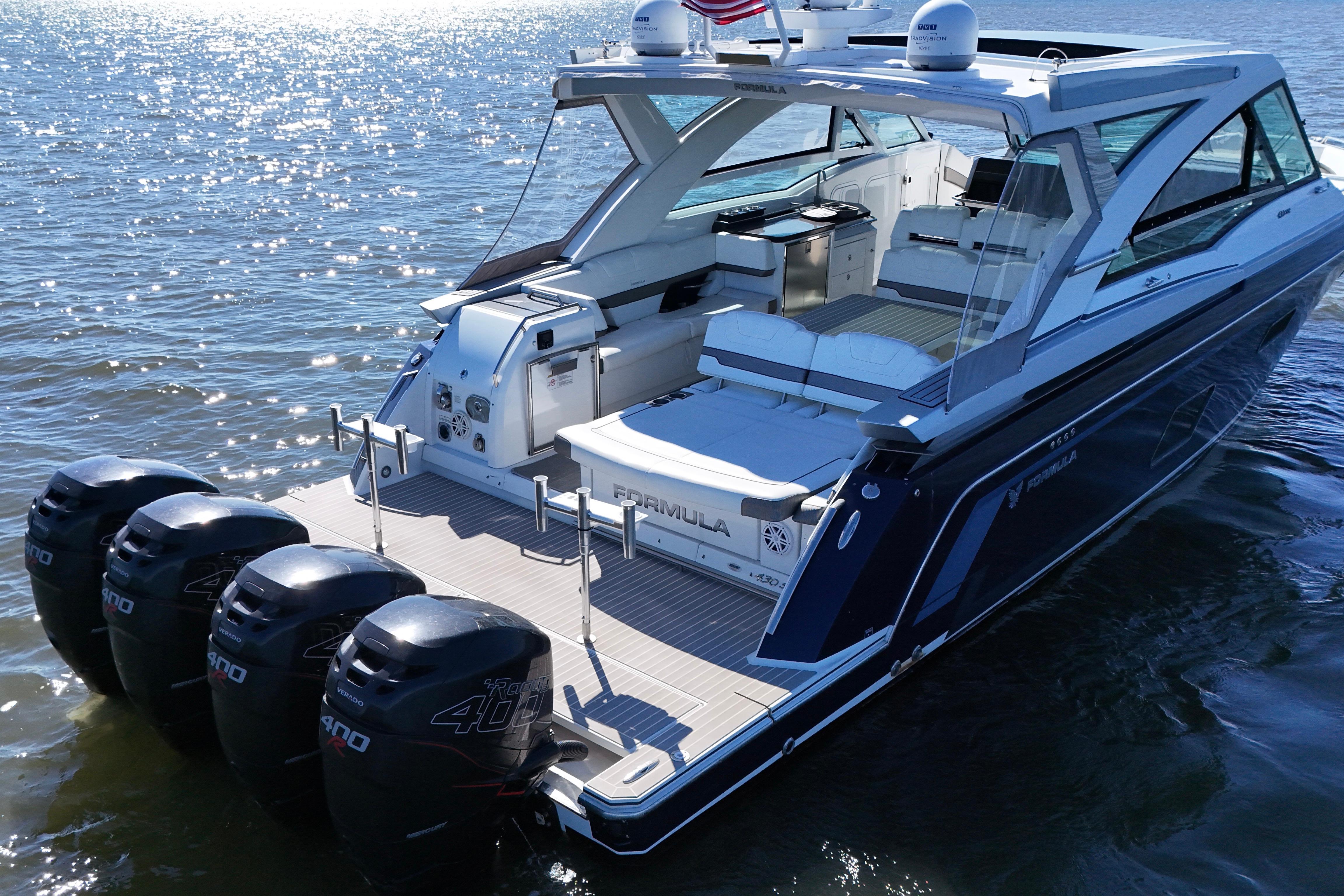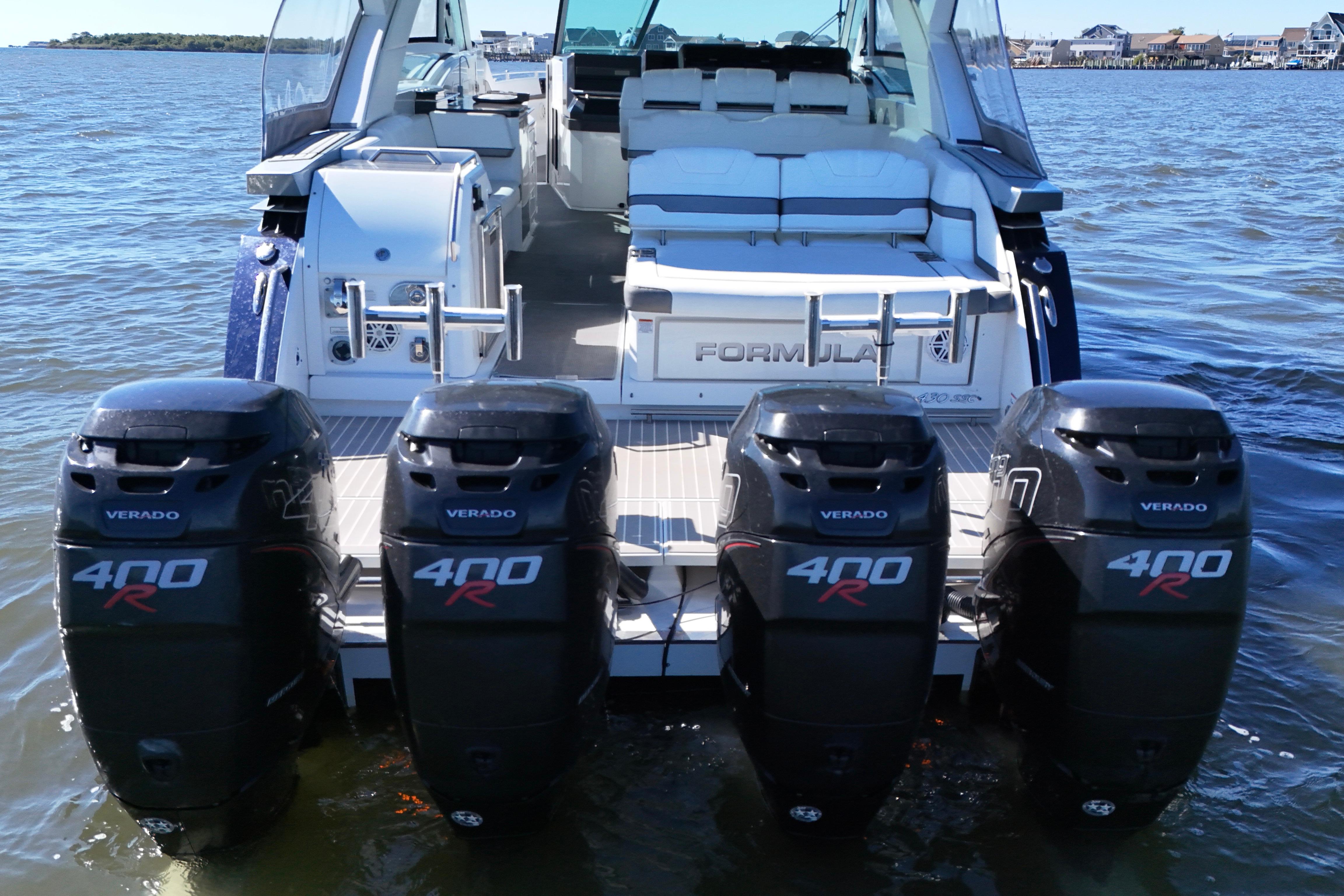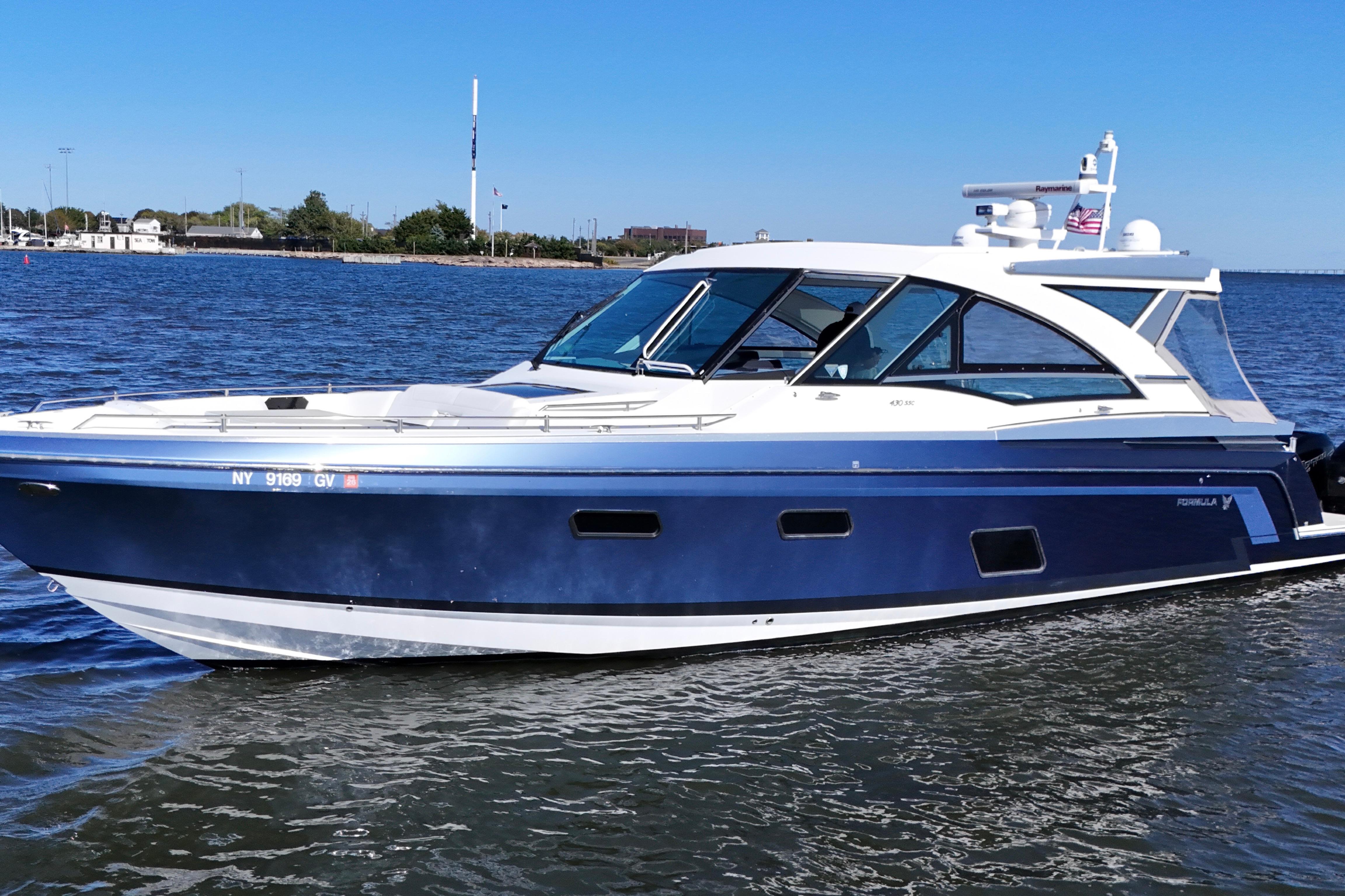 Introducing the 2017 Formula 430 Super Sport Crossover, a stunning cruiser that combines elegance with high performance. With an overall length of 43 feet, this vessel boasts a sleek fiberglass hull designed in a Deep Vee shape, ensuring a smooth ride even in choppy waters. Powered by four Mercury Verado 400R outboard engines, each delivering 400 horsepower, it reaches cruising speeds of 40 mph and a maximum hull speed of 65 mph, making it perfect for thrilling adventures on the water. Accommodating up to 12 guests, this boat features two cabins and one head, providing comfort for extended outings. An electric windlass enhances convenience, while the joystick control adds to the ease of maneuverability. With only 300 hours of use, this used cruiser is ready for new adventures, offering a perfect blend of luxury and performance for discerning boaters. Experience the joy of cruising with the Formula 430 Super Sport Crossover!