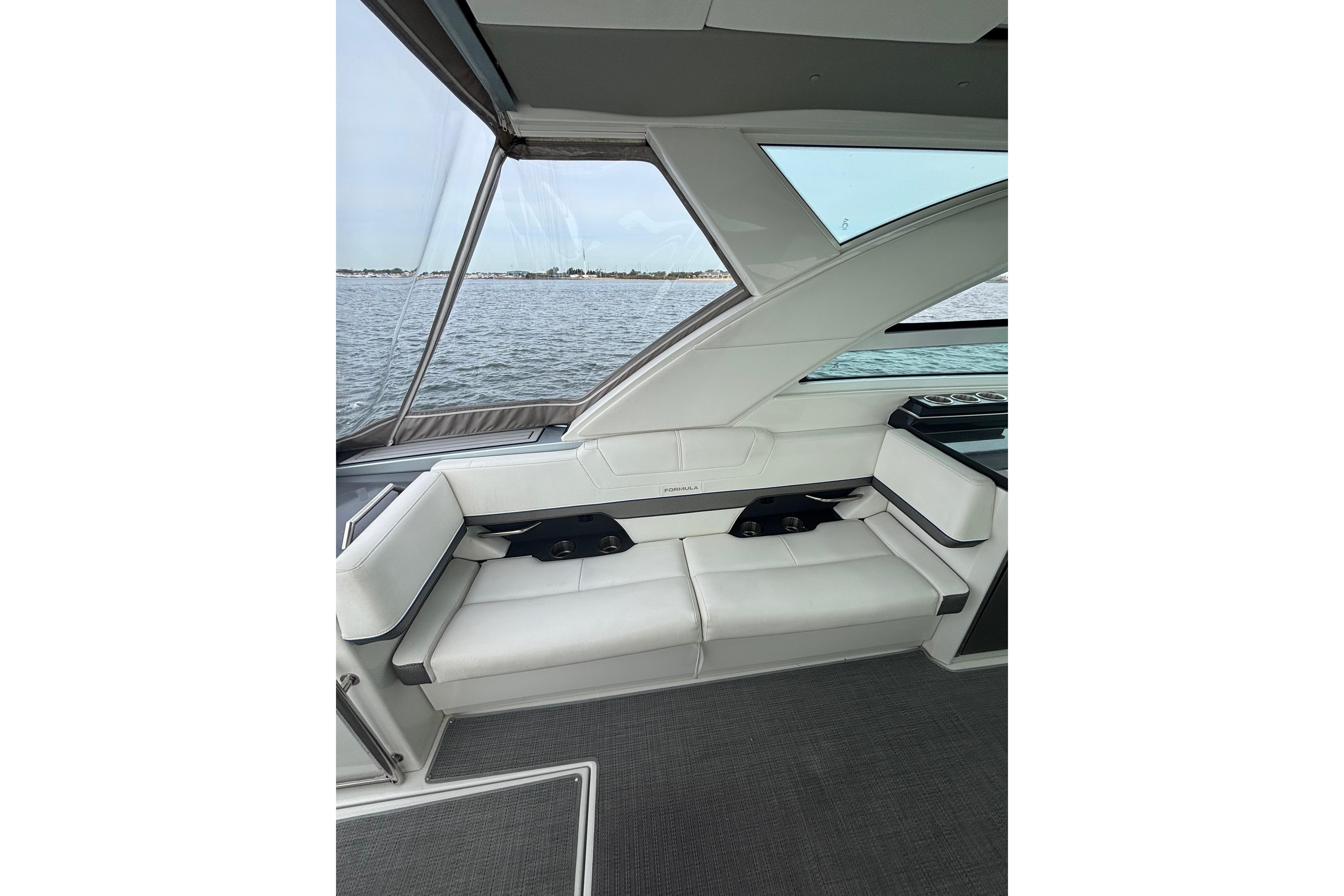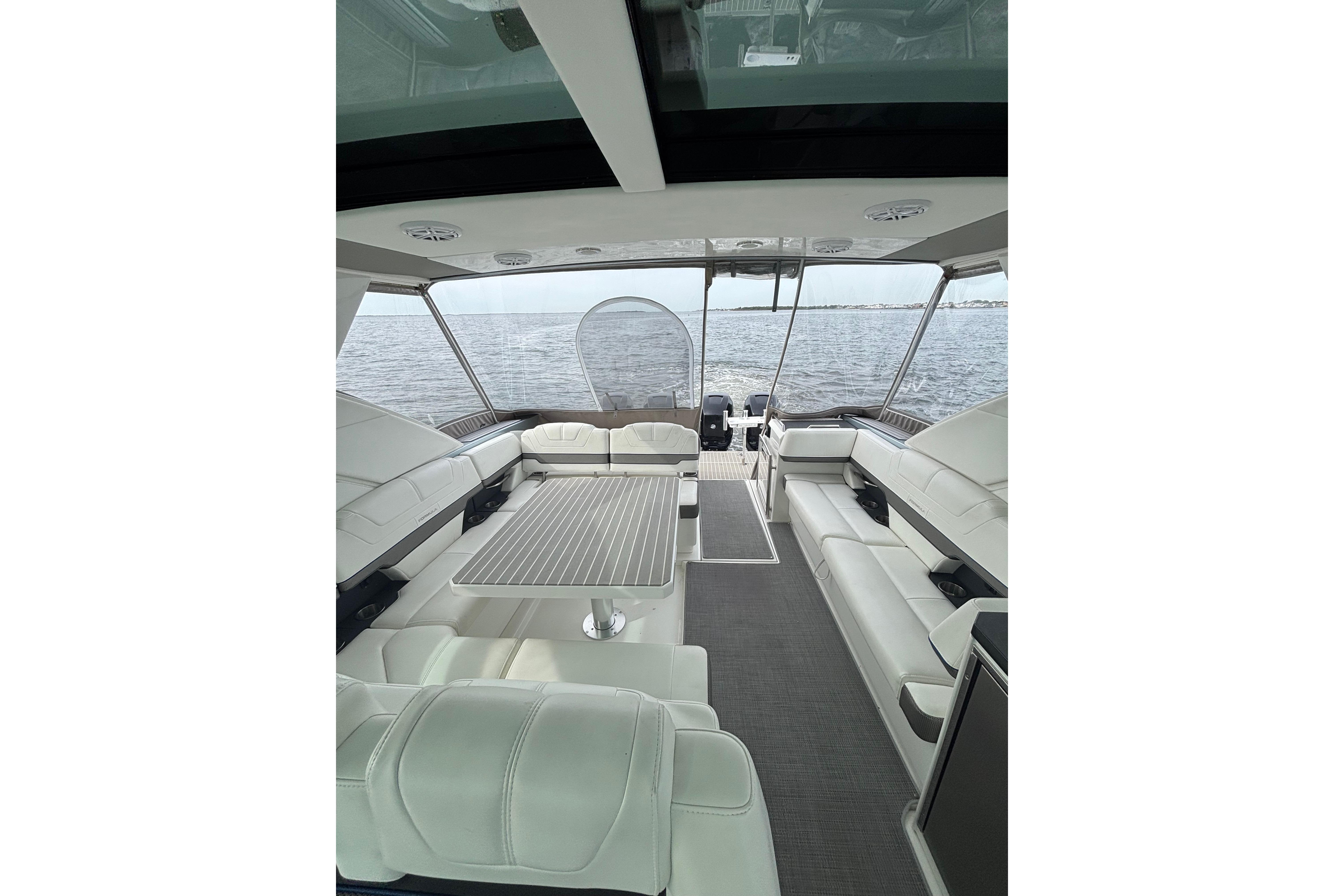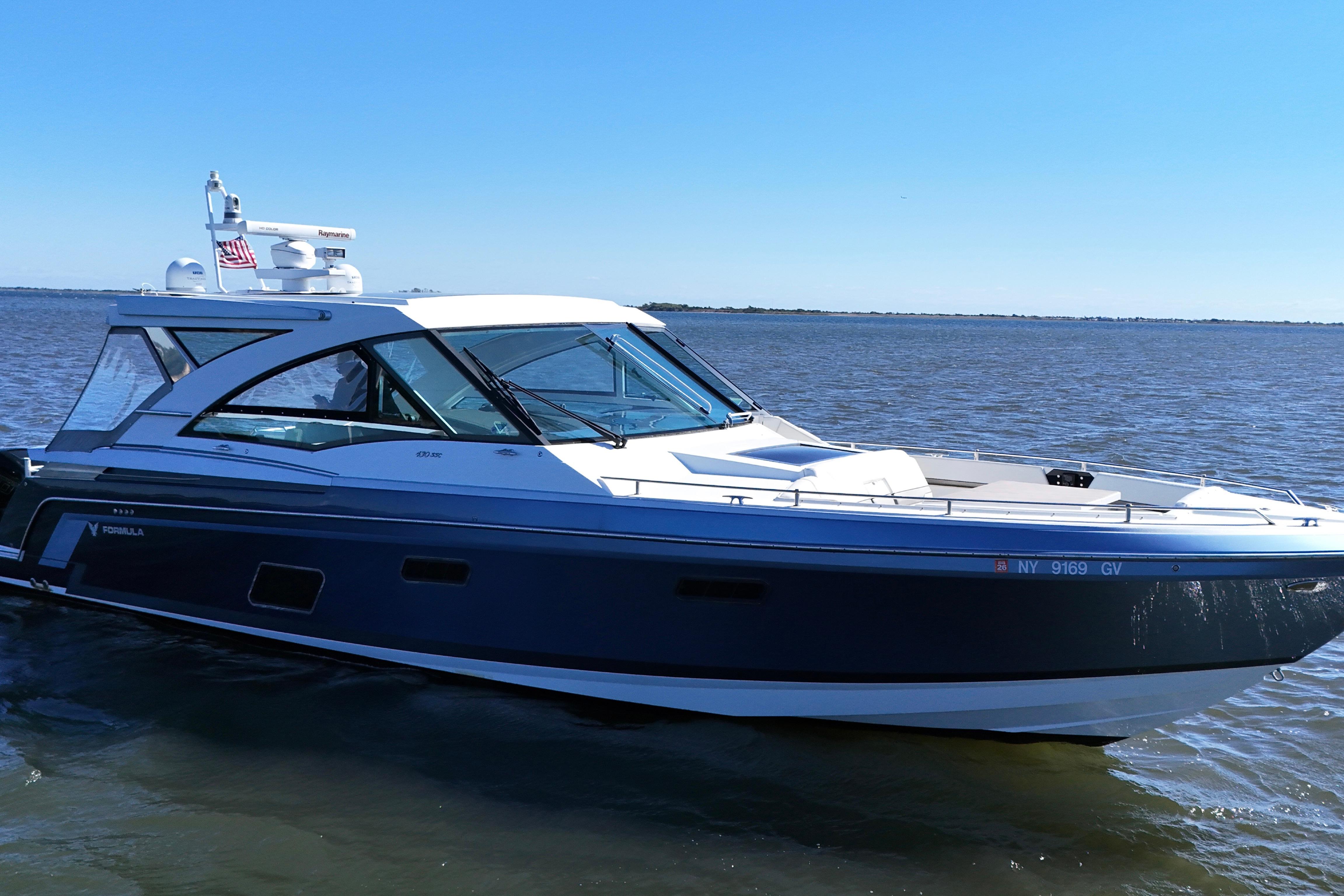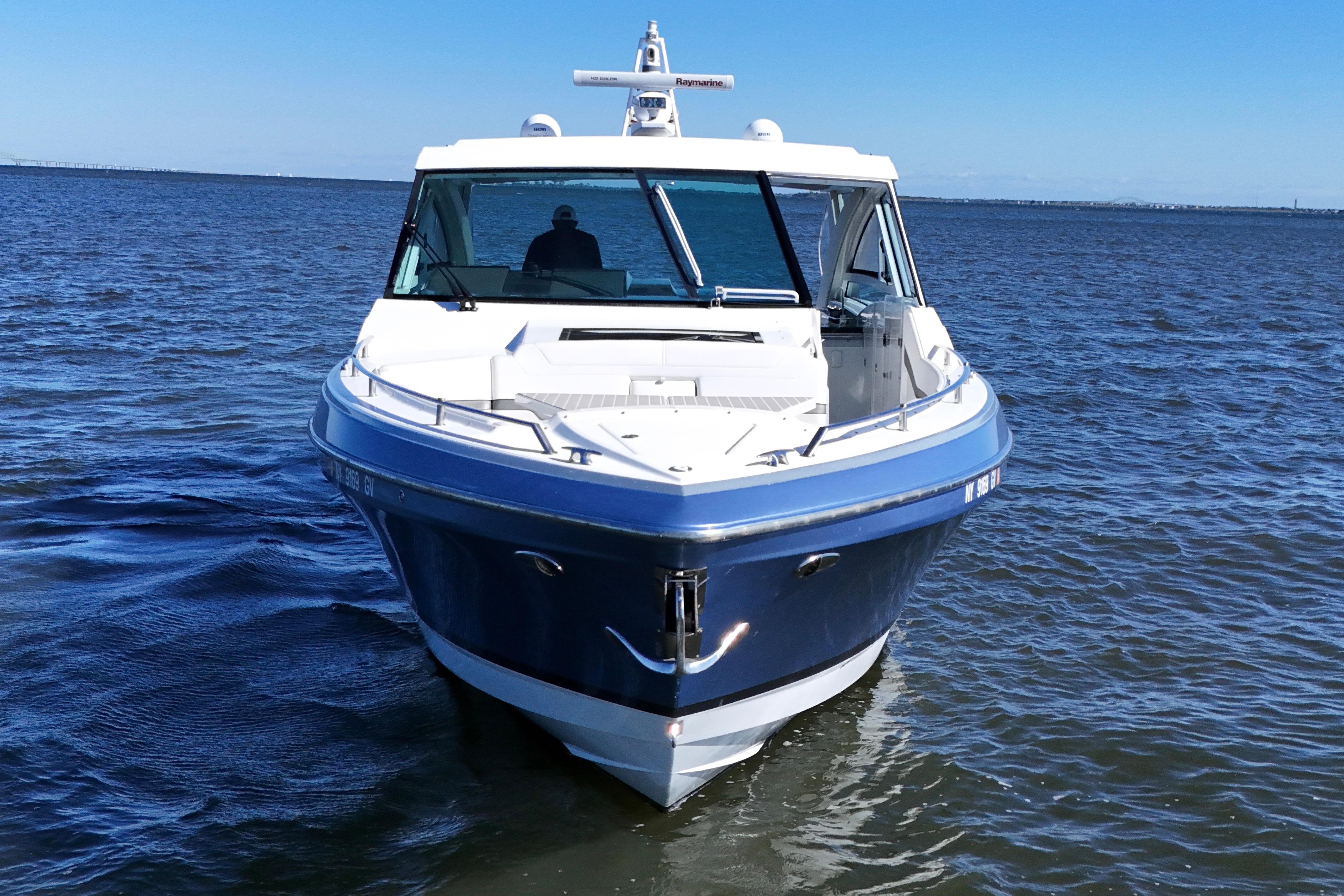 Introducing the 2017 Formula 430 Super Sport Crossover, a stunning cruiser that combines elegance with high performance. With an overall length of 43 feet, this vessel boasts a sleek fiberglass hull designed in a Deep Vee shape, ensuring a smooth ride even in choppy waters. Powered by four Mercury Verado 400R outboard engines, each delivering 400 horsepower, it reaches cruising speeds of 40 mph and a maximum hull speed of 65 mph, making it perfect for thrilling adventures on the water. Accommodating up to 12 guests, this boat features two cabins and one head, providing comfort for extended outings. An electric windlass enhances convenience, while the joystick control adds to the ease of maneuverability. With only 300 hours of use, this used cruiser is ready for new adventures, offering a perfect blend of luxury and performance for discerning boaters. Experience the joy of cruising with the Formula 430 Super Sport Crossover!